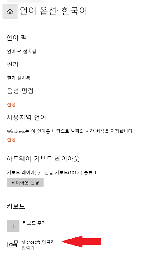 하여튼 한컴(한글과컴퓨터) 입력기를 제거하고 위와 같이 Microsoft 입력기 하나만 남기면 됩니다.