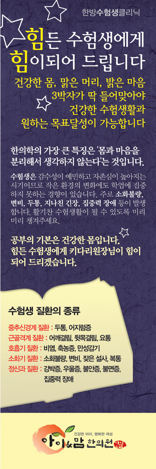 주로 소화불량, 변비, 두통, 지나친 긴장, 집중력 장애 등이 발생합니다. 활기찬 수험생활이 될 수 있도록 미리미리 챙겨주세요.