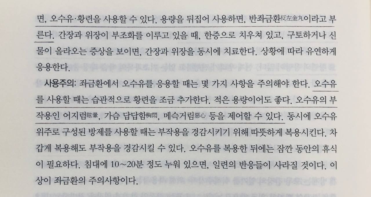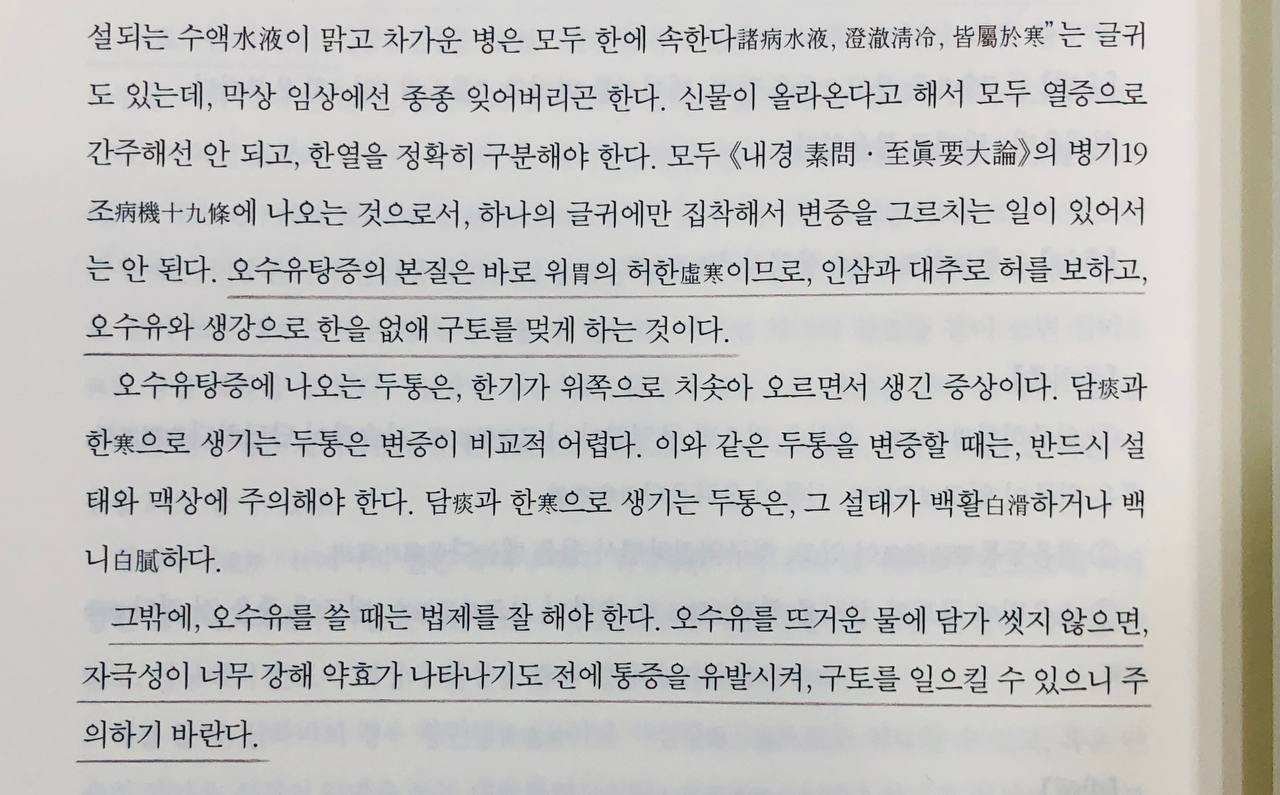 "오수유는 胃와 肝을 따뜻하게 하여 寒을 없애주고, 또 거꾸로 올라오는 기를 아래로 내려주어 구토를 멎게 한다. 오수유탕의 가장 큰 특징은 구토를 멎게 하는 것이다." -왕멘즈 방제학 강의