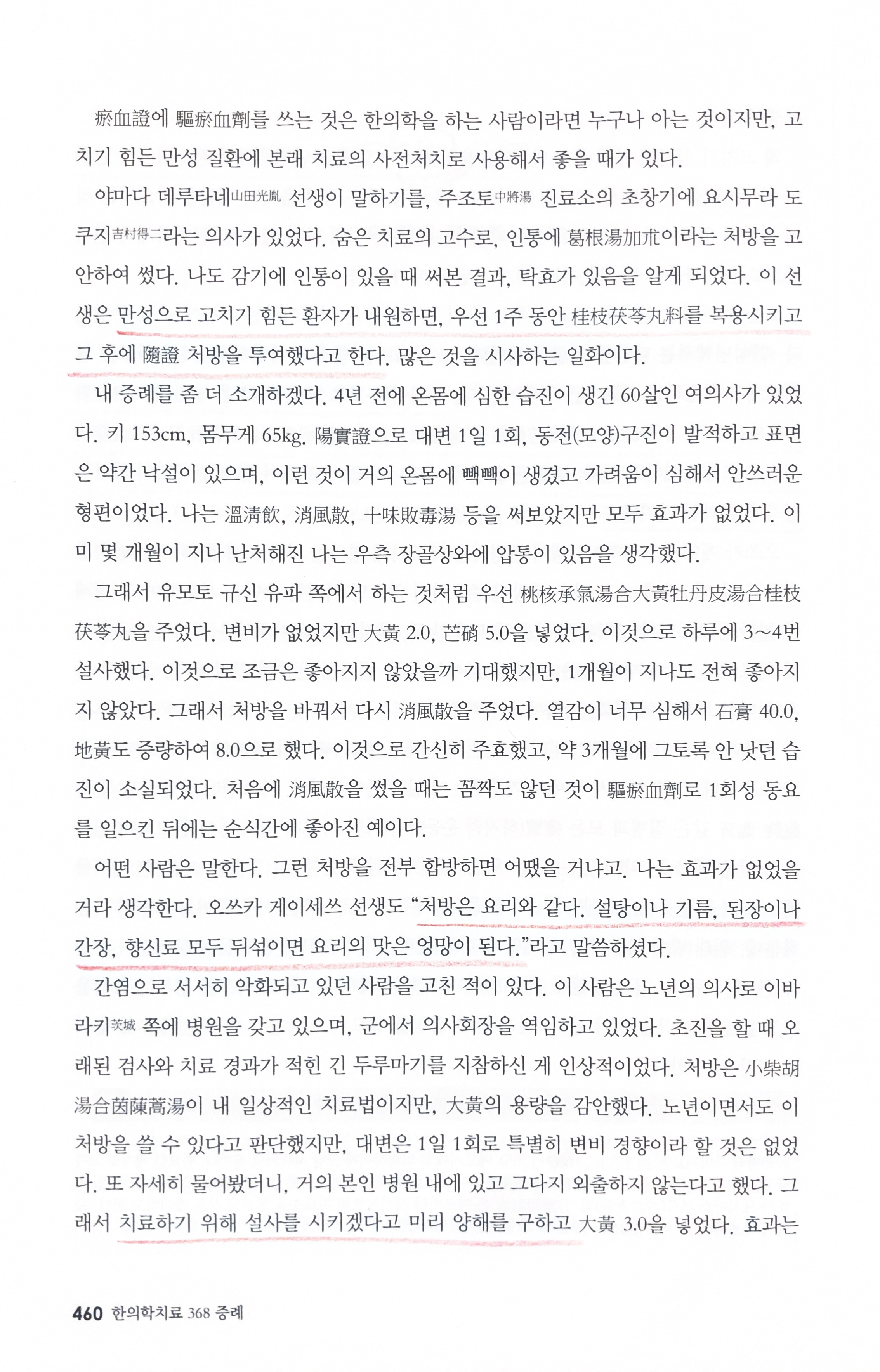 어떤 사람은 말한다. 그런 처방을 전부 합방하면 어땠을 거냐고. 나는 효과가 없었을거라 생각한다. 오쓰카 게이세쓰 선생도 "처방은 요리와 같다. 설탕이나 기름, 된장이나 간장, 향신료가 모두 뒤섞이면 요리의 맛은 엉망이 된다."라고 말씀하셨다.