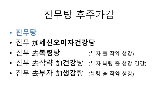 일단 감초가 빠진 건강부자탕, 진무탕, 부자탕... 이런 걸 떠올릴 수 있지만,