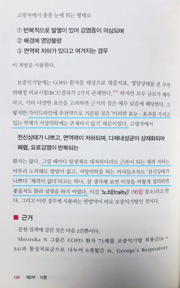 그럴 때마다 항생제로 대처하더라도 근본이 되는 체력 저하는 아무리 노력해도 방법이 없고, 서양의학을 하는 의사들조차도 '전신상태가 나쁘다' '체력이 없다'라고는 하나, 잘 생각해 보면 이것을 어떻게 정의하면 좋을지도 몰라 설명을 하기 어렵다. 이걸 '노쇠(frailty)'라고 한다.
