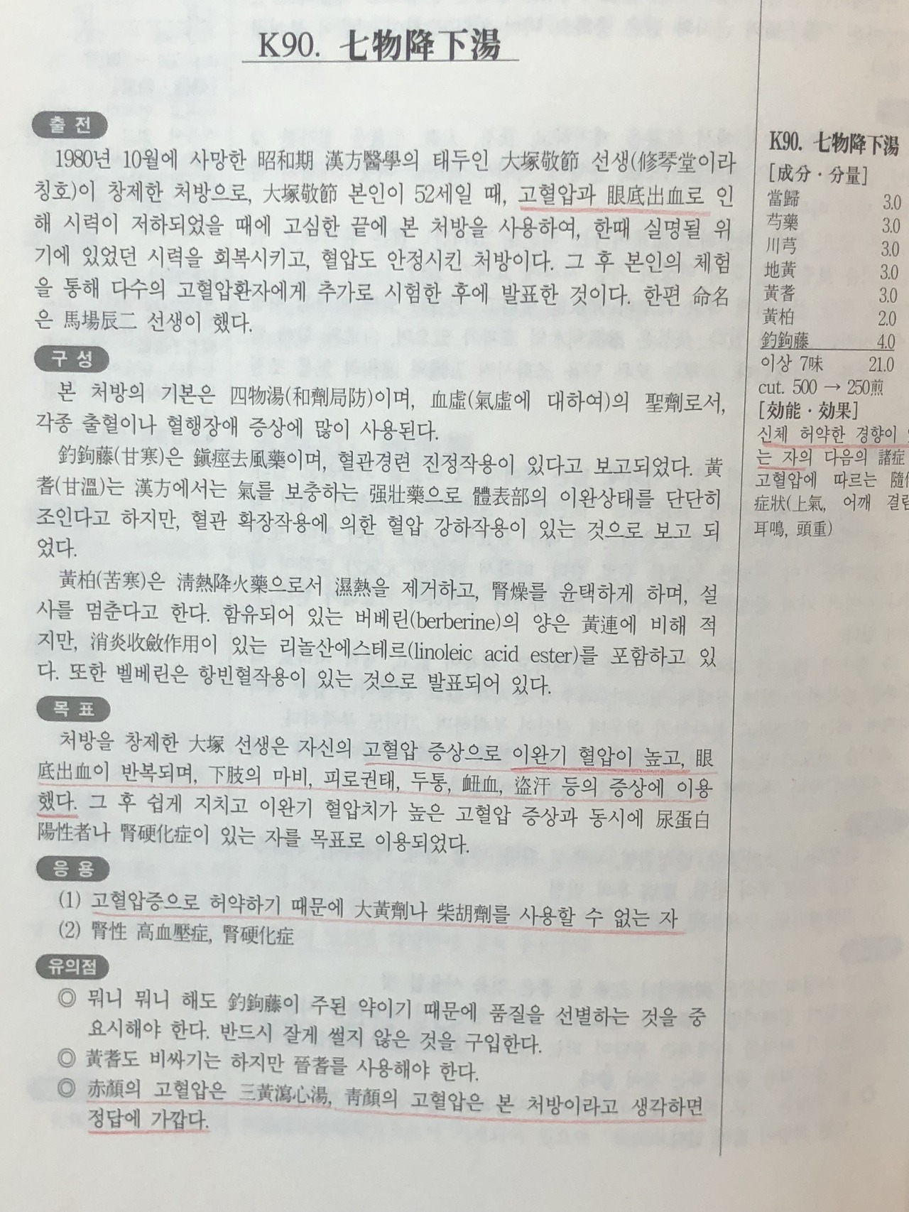 세번째 접근한 방법은 일본 근대의 명의 대총경절 선생이 본인의 고혈압과 안저출혈을 치료하기 위해서 창방한 칠물강하탕.
